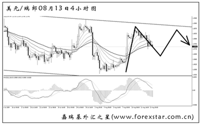 ▲美元兌瑞郎跌破大旗型中繼的下沿之后很快收起,是一次典型的假突破行為。匯價重新形成一個斜率平緩的下降通道,保持著橫盤震蕩的節奏。預計后市匯價仍將有一波上沖,但最終將在通道上沿的阻力下回歸跌勢。