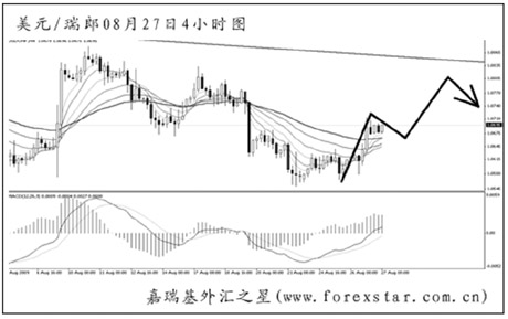 ▲美元兌瑞郎再度創出新低之后仍未能加速下行,日線圖下跌動能持續減弱。短線匯價波動凌亂,后市有向圖中的下降通道上沿發起沖擊的欲望。由于低位震蕩的時間已不短,形成階段性底部的可能性正在逐漸加大。