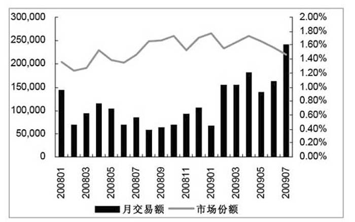 各月長江代理買賣證券總量和市場份額(包括股票、基金、權證和債券)