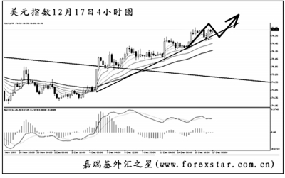 自從11月份非農數據打響美元反攻的第一槍,美元指數一路延續漲勢,并且突破前期高點,觸及76.70上方的五周新高。 美聯儲主席伯南克上周發表重要講話,稱美國經濟明年應該會繼續復蘇,但勞動力市場的疲軟狀況以及信貸緊縮局面可能令經濟增長腳步較為緩慢。他指出,美聯儲承諾將通脹維持在低水平,并有能力這么做。他還聲稱,美聯儲公開市場委員會目前仍然預計將在一段時間內維持低利率。有分析師指出,伯南克稱要穩定貨幣政策,對那些希望美聯儲會在強勁的11月份就業報告后加快升息步伐的投資者來說,這令其有些失望,由此對美元短期走勢形成了打壓。 美國11月零售銷售和12月密歇根大學消費者信心指數初值均好于預期,則增強了美聯儲將提早升息的預期。同時大宗商品價格走低,進一步對美元漲勢推波助瀾。 美元指數在周線圖上出現了難得的兩連陽。自今年3月份觸及89.62高點以來,美元指數持續回撤,期間僅兩次連續兩周收陽,但沒有出現過周線三連陽。美元這一次能否維持強勁走勢,打破塵封九個月的紀錄,這是目前許多市場人士關注的一個問題。短線上看,美指升破了圖中的下降趨勢線后漲勢強勁,均線系統多頭排列。預計美元小幅下調之后將繼續延續其升勢。