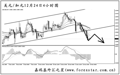▲美元兌加元將圖中的上升通道下沿發力跌破,即將考驗1.0405的支撐。短線下跌為主趨勢,可首先考慮做空美加。最近一個多月的時間,匯價持續處于1.0780到1.0400的區間內運行,區間突破后即將產生大行情,投資者可重點關注此貨幣。