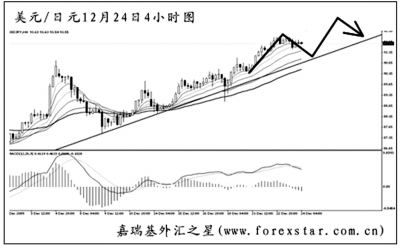 ▲澳元兌美元順利將0.8905的日線圖道氏理論支撐跌破,中線的漲勢告一段落。短線匯價將包含MACD底背離點的下降趨勢線升破,預計還將有一定程度的上調。關注0.8915一線的阻力,圖中均線系統的壓制位也在于此。澳元在這一帶遇阻回落的希望很大。