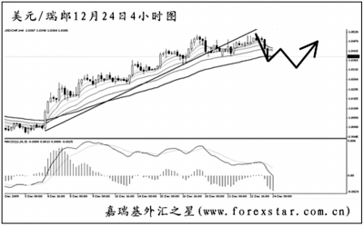 ▲美元兌瑞郎形成一個雙頂反轉形態的雛形,目前正在對頸線1.0385發起挑戰,若有效跌破,下方目標將有望看到1.0280一線。圖中的均線系統已被小幅跌破,短線可以先考慮做空,但只要暴發出新的多頭動能,匯價就很有希望回歸到大的漲勢之中。