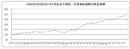 2007年5月,北京中高檔住宅成交領先指數為178點,均價為11583.2元/平方米,環比4月份成交價格上漲3.76%,仍然呈現穩步上漲狀態。但從成交量上來看,5月份同4月份相比較,二手房成交量雖然仍在上漲,但交易活躍度不高,漲幅在5%左右。