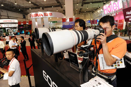 7月9日,觀眾正在體驗(yàn)專業(yè)數(shù)碼相機(jī)。 當(dāng)日,2009中國國際消費(fèi)電子博覽會(huì)(SINOCES)在青島開幕,1509個(gè)國際、國內(nèi)消費(fèi)電子和家電企業(yè)帶來了各自最新的消費(fèi)電子產(chǎn)品參展。據(jù)了解,來自全球30多個(gè)國家和地區(qū)的700多家采購商帶來了意向采購訂單,采購規(guī)模有望創(chuàng)歷屆“電博會(huì)”之最。