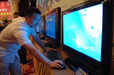 日前,數(shù)源科技公司發(fā)布搏卡系列數(shù)字電視,在網(wǎng)絡(luò)環(huán)境下可通過(guò)更換不同的功能卡,實(shí)現(xiàn)數(shù)字電視、電腦、多媒體播放器等功能的切換。圖為數(shù)源科技公司開(kāi)發(fā)部負(fù)責(zé)人在展示利用電視屏幕上網(wǎng)沖浪。 |