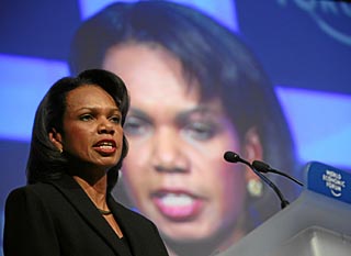 | 23日,美國國務卿賴斯在瑞士達沃斯舉行的世界經濟論壇年會上講話。當日,27位國家元首或政府首腦,110多位政府部長以及眾多知名企業領導人和政界人士聚首瑞士達沃斯,參加一年一度的世界經濟論壇年會。新華社發 | 本報綜合報道