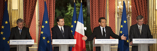 | 圖為12日,在法國首都巴黎,(從左至右)歐洲中央銀行行長特里謝、歐盟委員會(huì)主席巴羅佐、歐盟輪值主席國法國總統(tǒng)薩科齊和歐元集團(tuán)主席、盧森堡首相容克出席聯(lián)合新聞發(fā)布會(huì)。歐元區(qū)15國領(lǐng)導(dǎo)人當(dāng)天在巴黎召開的首腦會(huì)議上通過一項(xiàng)行動(dòng)計(jì)劃,同意由各國政府為銀行再融資提供擔(dān)保并向銀行注資,以共同應(yīng)對當(dāng)前的金融危機(jī)。新華社/路透 |