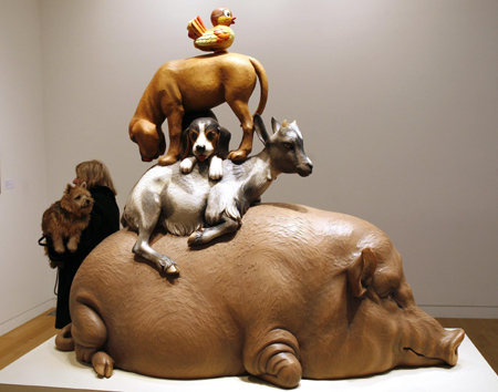 1月13日,美國藝術(shù)家杰夫·庫恩斯的彩色木雕作品“疊羅漢”在紐約索斯比拍賣行展出。這件彩色木雕作品將于2月5日拍賣,據(jù)估計(jì)將拍得340萬到490萬美元。
