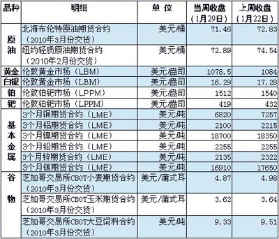 由于市場對中國有可能收緊貨幣政策的持續擔憂以及對世界宏觀經濟的謹慎展望,當周多數大宗商品延續前一周跌勢。 國際油價當周繼續下跌,主要受美元走強等因素影響,美元對歐元匯率創6個月來新高。美國商務部1月29日發布報告說,2009年第4季度美國經濟增長5.7%,連續第2個季度增長。該數據強化了市場有關美國經濟將比其他發達國家更快復蘇的觀點,致使美元走強、油價下跌。另外,投資者對原油需求前景仍然存在疑慮,也對油價形成打壓。英國石油公司首席執行官托尼·海沃德1月28日在達沃斯預測,今年石油價格將維持在每桶60美元至80美元之間。 當周美元走強和市場對稀有金屬價格繼續回落,國際金價已跌破每盎司1100美元。有報道援引興業銀行研究處資深黃金分析師蔣舒博士的話說,進入新年以來,全球經濟形勢仍不明朗,一些主要經濟體尤其是美國公布的重要經濟數據直接影響了金價走勢。除鎳價有所上升之外,倫敦金屬交易市場其他基本金屬3個月期貨價格當周都在下跌,其中銅價降幅最大。 在觸及3個多月來低點后,芝加哥期貨交易所(CBOT)農產品期貨28日小幅反彈。南美作物產量巨大繼續為市場帶來壓力。