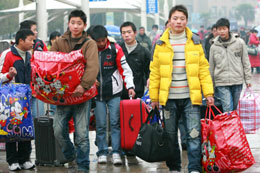 近日,幾名外來務工者結伴趕往蘇州 火車站,提前回安徽老家過年。本報記者:王建中