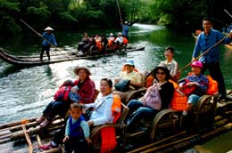 旅客在武夷山九曲溪乘坐竹筏。 本報記者:張國俊