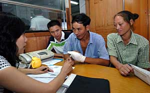 | 重慶首個(gè)農(nóng)民工法律援助站受歡迎。8月17日上午,三名農(nóng)民工在法律援助站向律師胡佳(左)進(jìn)行咨詢。 新華社記者