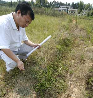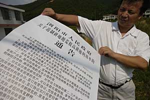 | 瀏陽市工作人員展示一張有關遏制耕地拋荒的政府通告。 |