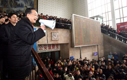 1月29日,溫家寶總理在湖南長沙火車站看望滯留車站的旅客。溫家寶對旅客說,春節快到了,我給大家拜個早年。你們被困在火車站,還沒能提早回家,我表示深深的歉意,現在我們正在想盡一切辦法搶修,一定把大家送回家過春節。新華社記者:姚大偉 攝