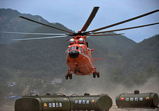 | 5月31日,在四川省北川縣擂鼓鎮(zhèn),有“巨無霸”之稱的米—26多用途重型運(yùn)輸直升機(jī)剛剛完成搶險(xiǎn)設(shè)備吊運(yùn)任務(wù)。新華社記者