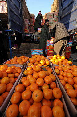 | 在位于哈爾濱市的哈達水果批發市場,南方柑桔銷售商在促銷柑桔。新華社記者