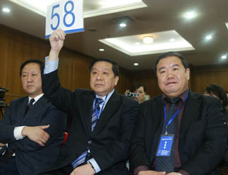 | 3月4日,北京三元集團(tuán)有限責(zé)任公司與河北三元食品有限公司組成的聯(lián)合競(jìng)拍體代表在“三鹿集團(tuán)”破產(chǎn)首次拍賣會(huì)上舉牌競(jìng)拍。新華社發(fā)(丁立新
