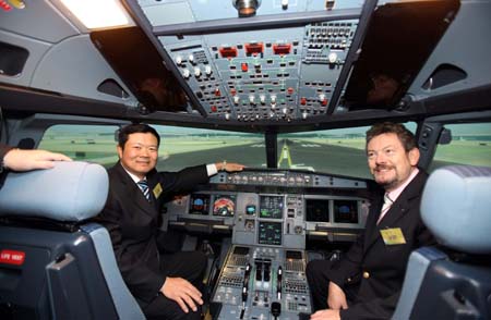 近日,中國民航局購買的首臺(tái)空中客車A320全動(dòng)模擬機(jī)在華歐航空培訓(xùn)中心新樓投入運(yùn)營。該模擬機(jī)可動(dòng)態(tài)模擬飛行實(shí)況,將被用來培訓(xùn)中國民航局的飛行監(jiān)察員以及各航空公司的飛行員、機(jī)械師和乘務(wù)員。 圖為在位于北京的華歐航空培訓(xùn)中心,嘉賓在體驗(yàn)新投入運(yùn)營的空中客車A320全動(dòng)模擬機(jī)。新華社記者:侯俊