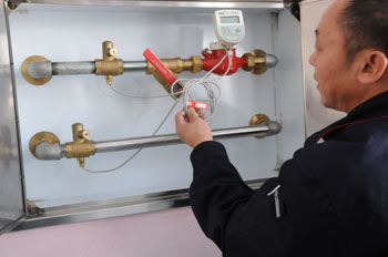 沈陽航發熱計量技術有限公司技術人員正在演示入戶熱計量表的使用方法。
