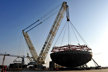 4月9日,3200噸履帶式大吊車正將直徑(內徑)39.6米的CV底封頭從運輸車上吊起。當日,建設中的山東海陽核電站項目一號核島重大節點工程CV(鋼制安全殼)底封頭成功實現整體吊裝。新華社記者 李紫恒/攝 |