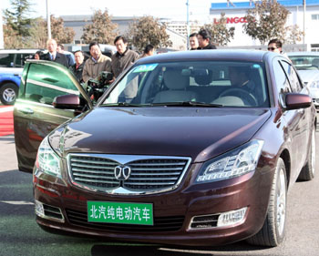2009年11月14日,北汽集團首次展示自主研發的“北京牌”純電動轎車。該車最高時速為160公里,時速0至100公里加速時間小于15秒,一次充電行駛里程可達200公里。一次充電時間,快充為1小時,慢充為10小時。 北汽集團旗下的北京新能源汽車公司也于當日正式成立,到2011年將形成年產各類新能源汽車2萬到4萬輛的規模。本報記者 李志勇/攝 |