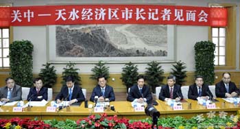 | 2010年4月9日,關(guān)中—天水經(jīng)濟區(qū)“七市一區(qū)”市長在西安與中外媒體記者見面,通報《關(guān)中—天水經(jīng)濟區(qū)發(fā)展規(guī)劃》實施情況。資料照片 |