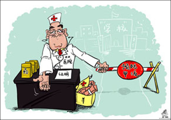 新聞背景:前幾天,平日冷清的河南新密市茍?zhí)面?zhèn)衛(wèi)生院突然熱鬧起來。學(xué)生家長排隊(duì)搶購衛(wèi)生院配制的預(yù)防甲型H1N1流感的中草藥。原來,上周末,茍?zhí)面?zhèn)中小學(xué)和幼兒園學(xué)生都接到了一個(gè)特殊的任務(wù):到茍?zhí)面?zhèn)衛(wèi)生院買中藥,沒有這家醫(yī)院開具的證明,不能上學(xué)。茍?zhí)面?zhèn)衛(wèi)生院坐等顧客,3天進(jìn)賬3.6萬元。(11月7日
