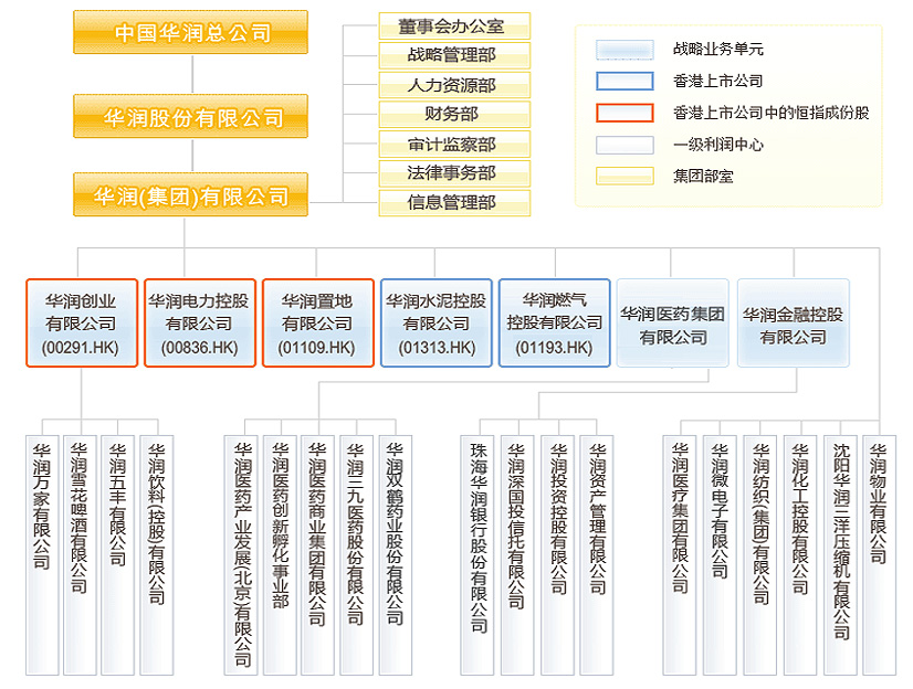 | 華潤前身是1938年中共為抗日戰爭在香港建立的地下交通站。1948年改組更名為華潤公司,1952年隸屬關系由中共中央辦公廳變為中央貿易部(現為商務部)。1983年改組成立華潤(集團)有限公司。1999年12月,與外經貿部脫鉤,列為中央管理。2003年歸屬國務院國有資產監督管理委員會領導下的中央企業。主營業務包括日用消費品制造與分銷、地產及相關行業、基礎設施及公用事業三塊領域,旗下共有20家一級利潤中心,在香港擁有5家上市公司:華潤創業(HK291)、華潤電力(HK836)、華潤置地(HK1109)、華潤水泥(HK1313)和華潤燃氣(HK1193)。2013年7月8日,《財富》雜志發布的世界500強排行榜,華潤集團名列187位,首次進入200強,排名上升46位。 |