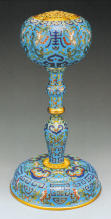 琺瑯釉料的主要原料是石英、長石、瓷土等,它以純堿、硼砂為熔劑,以氧化鈦、氧化銻、氟化物為乳化劑,金屬氧化物為著色劑,經(jīng)過粉碎、混合、熔融后,傾入水中急冷成琺瑯熔塊,再經(jīng)細(xì)磨而得琺瑯粉,或配入粘土經(jīng)濕磨而得琺瑯漿。琺瑯屬硅酸鹽類物質(zhì),琺瑯釉為低溫色釉,燒結(jié)溫度一般在1000攝氏度以下。琺瑯釉料的另一特征是表面的沙眼現(xiàn)象,是硼酸鹽含量過高以及燒制過程中的氧化還原作用所引起的。工匠們常用“蠟補(bǔ)”的方法來補(bǔ)救,即用石蠟加入色粉制成色蠟,填充于沙眼之中。到乾隆時期,經(jīng)改進(jìn)工藝,基本杜絕了沙眼現(xiàn)象。 乾隆帝對于琺瑯器有著全面的愛好,這一點(diǎn)非常像其祖父康熙皇帝,所以乾隆帝御極之后,大量生產(chǎn)各類琺瑯器,不僅宮廷琺瑯作承造御用品,京都、廣州和揚(yáng)州等地均生產(chǎn)用于進(jìn)貢的琺瑯器。乾隆帝也遵循雍正帝確立下來的“內(nèi)廷恭造之式”,要求匠役要遵循旨意,做工須符合精細(xì)、秀雅的藝術(shù)標(biāo)準(zhǔn)。由此,乾隆內(nèi)廷的琺瑯制品無不是繁縟華麗、豐滿敦重的藝術(shù)格調(diào)。 封建社會禮制森嚴(yán),規(guī)矩繁多。皇帝貴為天子,身為一國之君,對于自身形象的要求乃為重中之重,故此對于皇帝本人的限制也有很多,這些要求不光體現(xiàn)在不同的場合要穿不同的衣服,對于衣服的處理也是很重要的,比如對于袍服等的熏香。要平時利用香料等方式將衣帽熏透,以便在重要場合中所著衣裝可散發(fā)出悅?cè)说南阄叮@也是一種很重要的禮節(jié)。正是出于此種目的,于是此件帽架的設(shè)計(jì)便帶有此種功用,它不但要擔(dān)當(dāng)置放官帽的杖托,還要于頂端開口處置放可散發(fā)出香味的香料以用來熏透官帽,可見此種帽架的設(shè)計(jì)有其內(nèi)在的涵義。