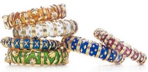 他運用這一工藝,在紅、綠、藍、玫瑰和白色的點綴下制作手鐲,這款作品也是杰奎琳-肯尼迪的最愛。照片中的她經常佩戴這款手鐲,以至于該作品被稱作“杰姬的手鐲(Jackie