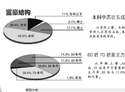 從年齡上看,60后、70后是千萬(wàn)富豪的主力軍,80后占11.8%的比重。