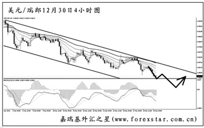 ▲美元兌瑞郎跌破日線圖旗形下沿之后,沿通道一路走弱,目前匯價正在挑戰10月中旬的低點0.9460支撐,跌破后下方空間將無比廣闊。最近瑞郎的走勢分化,且是歐系貨幣中最強勁的。目前對美元兌瑞郎絕對不能抱以抓底的思路,應等待調整節奏出現后繼續做空。