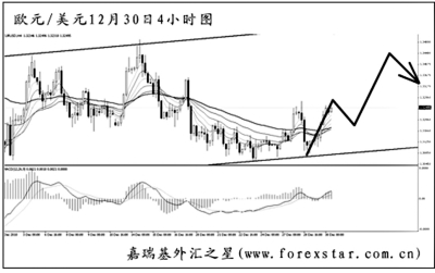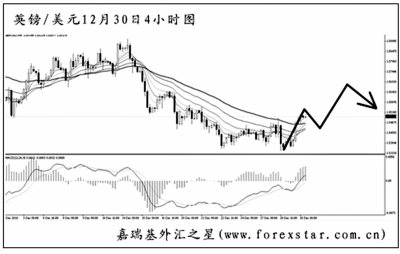 ▲英鎊兌美元短線下跌的動能有所減緩,圖中MACD的底背離發揮了一定的效果,匯價已經將均線系統升破,客觀趨勢進入到轉換市。圖中道氏理論顯著高點阻力1.5510已被突破,后市英鎊將上行挑戰1.5650一線?紤]到英鎊的弱勢,匯價直接大幅沖高的希望不大。