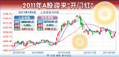 1月4日,2011年首個交易日,A股迎來了開門紅。地產(chǎn)股全面爆發(fā),帶動滬指收紅。市場的強勢表現(xiàn)使得多數(shù)分析師對后市比較樂觀,大盤短期仍然有望震蕩向上,但亦有機構(gòu)提醒投資者需注意一日游行情的可能性。