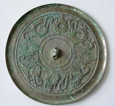 唐代銅鏡的鑄造吸收了漢代的傳統工藝,從現在的一些仿漢鏡來看,唐代仿制的品種不多,僅是繼承基礎上的仿古。最常見的是漢代流行的蟠螭紋鏡、規矩禽獸紋鏡和七乳禽獸紋鏡。漢代銅鏡紋飾基本上是用陽文雙鉤線條組成,輪廓纖細,但凸起較高,流暢犀利。線條之間的地子,光滑平整。唐鏡制作精良,但唐仿古鏡的紋飾,線條粗率,流暢程度也略為遜色,給人溢范的感覺,底面有不平整感。