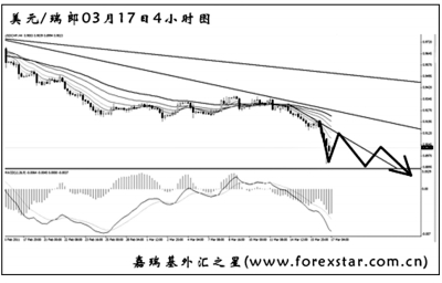 ▲美元兌瑞郎在經過了3周的橫盤之后,選擇繼續加速下行,且下跌斜率再度加大。由于美元兌瑞郎已經創出歷史新低,下方已沒有任何支撐可以托住匯價,但下跌力度過大,預計將發生一定的調整,圖中最下方一條壓力線將首先遭到挑戰,但想直接觸碰中間那條趨勢線的難度較大。
