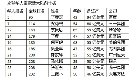 中國大陸地區首富為百度的李彥宏,他以94億美元的身家超過了前首富——娃哈哈的宗慶后(59億美元)。此外,三一重工的梁穩根(80億美元)憑借去年三一重工股價的飆升,財富猛增122%,成為中國大陸第二富豪。宗慶后今年排在大陸富豪第三位。