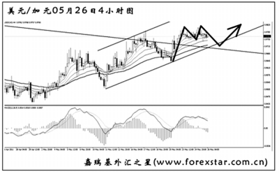▲美元兌加元經過了近一個月的反彈走勢,終于將日線圖的下降壓力線升破,MACD也進入到了多頭動能充盈的階段。圖中顯示,匯價的上行過程中伴隨著強動能交替走勢,目前形成了一個上升通道,均線系統依托排列。預計美元兌加元將首先下調挑戰通道下沿的支撐,隨后將繼續以上沖為主基調。