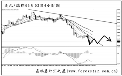 ▲美元兌瑞郎再度強悍創出新低,由于下方已沒有任何可以阻擋住匯價下跌的支撐位,所以我們無法根據價位來預測瑞郎何時能夠見底回升。現在短中線的主客觀方向均向下,操作只能是以繼續做空為主思路。首先關注圖中最近一條下降壓力線的阻力,預計美瑞突破此線的概率較大,進而挑戰0.8550附近區域。