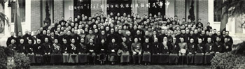 如華辰2011年春拍中的第1046和1047號拍品同為“中國文學藝術工作者第四次代表大會”的大合影,兩張照片內容為同一事件,拍攝日期也完全一樣,但除了第一排中間的領導人外,其他被攝者卻不一樣,而且照片制作的材質也并不完全相同,這些問題讓考證人員和藏家困惑許久。中國文學藝術工作者第四次代表大會是文革結束后的第一次文化藝術界的盛會,3200多位文革劫后余生的各個領域名人出席了大會。經過計算,每張照片上大約有七、八百人,從而得知,原來是與會人員眾多,與會代表們只好分批與領導人合影。這樣看來,最少應有四張不同畫面的大合影。而只有收齊這四張照片,才能全面地反映出“中國文學藝術工作者第四次代表大會”的全貌。