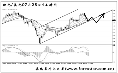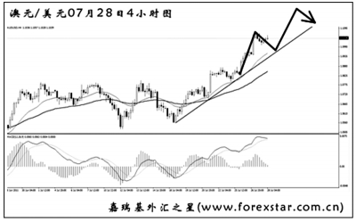 澳元兌美元經過了2個半月的調整,終于再度上沖創出新高,日線圖的次要節奏調整宣告成立。由于澳元上方也沒有任何有效的阻力,現在的操作思路以做多為主。圖中的上升趨勢線為最近的支撐,警惕匯價向此趨勢線調整,但直接跌破的希望不大。