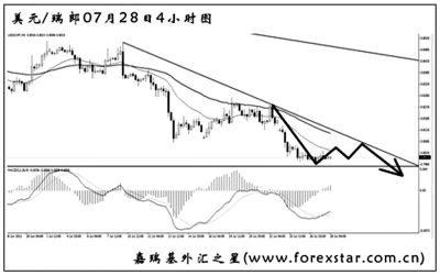 美元兌瑞郎在經過一段震蕩走勢之后繼續創新低,瑞郎的漲勢無法阻擋。由于瑞郎最近持續處于極端強勢的走勢中,且下方沒有任何有效支撐,短線匯價即使展開一小波調整,但升破圖中下降趨勢線及均線系統的希望也不大,后市美元兌瑞郎將以沖高后繼續走低的趨勢為主。