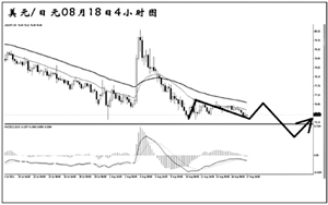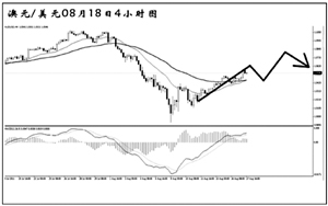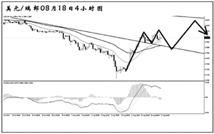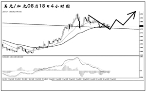 美元兌瑞郎在創出0.7070的低點之后強力反彈,接連升破了兩條下降壓力線的阻力,同時,4小時圖均線系統已經形成多頭排列,瑞郎的強勢基本告一段落。目前匯價在對此前的上漲進行修正,短線再度回抽趨勢線的希望較大,此后有望繼續上行,向周線圖趨勢線阻力0.8300一帶挺近。