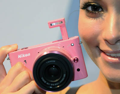 9月21日,日本尼康公司在香港舉行新聞發(fā)布會,宣布推出全新的輕便型無反光鏡可換鏡頭相機Nikon 1系列以及專用的尼克爾鏡頭,首推“Nikon 1 J1”“Nikon 1 V1”兩款新產(chǎn)品,并于10月20日開始全球發(fā)售。圖為模特在展示Nikon 1 J1相機。