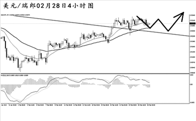 美元兌瑞郎突破大級(jí)別下降壓力線(xiàn)之后持續(xù)盤(pán)整,短線(xiàn)上沖力度有所減弱。由于日線(xiàn)圖道氏高點(diǎn)阻力0.9385并未被有效升破,中線(xiàn)上的下跌趨勢(shì)沒(méi)有結(jié)束。短線(xiàn)匯價(jià)有再度回抽趨勢(shì)線(xiàn)的風(fēng)險(xiǎn),關(guān)注下方支撐0.9250,只要匯價(jià)能夠站穩(wěn)在此位置上方,后市仍將以上漲為主。