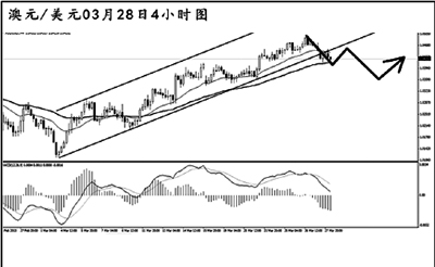 澳元兌美元在通道之內完成了一波完好的5浪上漲,短線匯價下調,已將通道下沿跌破。日線圖MACD仍處于多頭動能充盈的階段,只要澳元不跌破1.0340一線,則中線上仍有繼續上沖挑戰1.0600阻力的欲望。目前需關注小通道下沿的阻力作用,預計匯價將小幅向上回抽,此后仍有一波下調的風險。