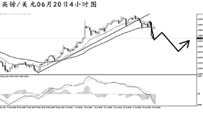 歐元兌美元在連續發生MACD的頂背離信號之后,匯價終于大幅回落。4小時圖均線系統和1.3275的道氏低點雙雙被跌破,歐元的漲勢告一段落。短線匯價面臨一定的上調風險,但小時圖主趨勢已轉為向下,預計歐元將繼續下攻1.3175的支撐,若跌破將會打開進一步的下行空間。