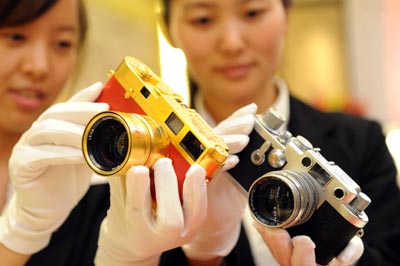 為紀念萊卡相機誕生100周年,香港仕宏拍賣有限公司將于6月22日在香港舉行萊卡百年精典收藏相機拍賣會,屆時將拍賣198款從世界各地收集來的萊卡稀有藏品。圖為在北京舉行的新聞發布會上,工作人員在介紹即將拍賣的中華人民共和國建國60周年紀念版萊卡相機和萊卡IIIG/IIIF相機。