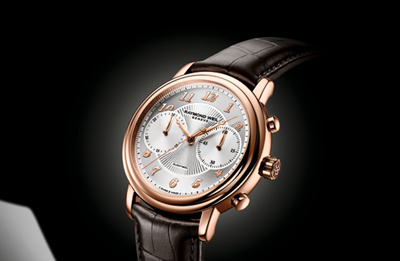 計時裝置位于三點鐘和九點鐘位置,指針是雷蒙威最經典的款式,鍍以玫瑰金,和金色的數字交相輝映。表殼直徑為41毫米,最后搭配經典的棕色鱷魚皮表帶,賦予高貴陽剛之氣。